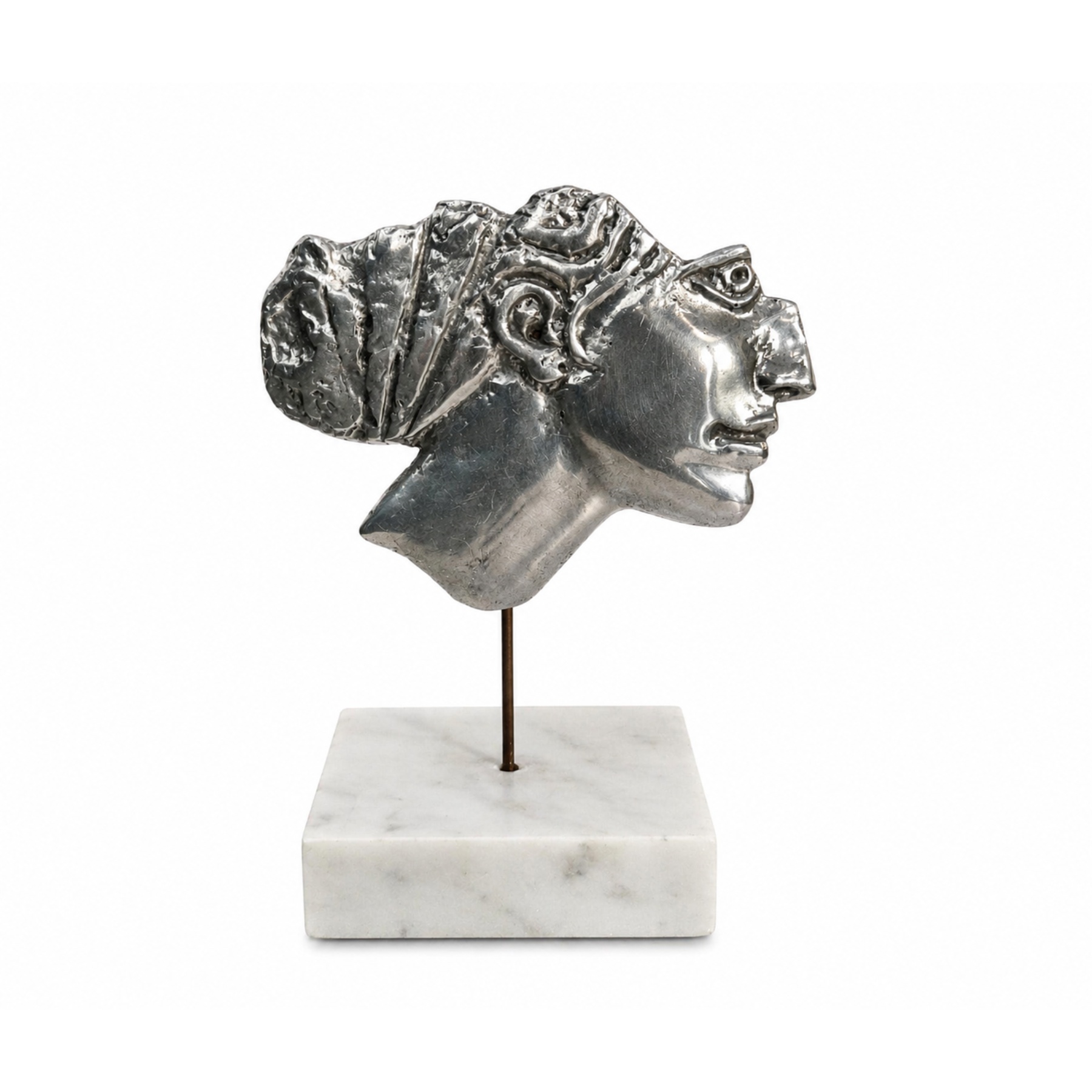 Ένα χειροποίητο γλυπτό από την Ηλιού Ρόζα, κατασκευασμένο από αλουμίνιο και τοποθετημένο πάνω σε μαρμάρινη βάση.